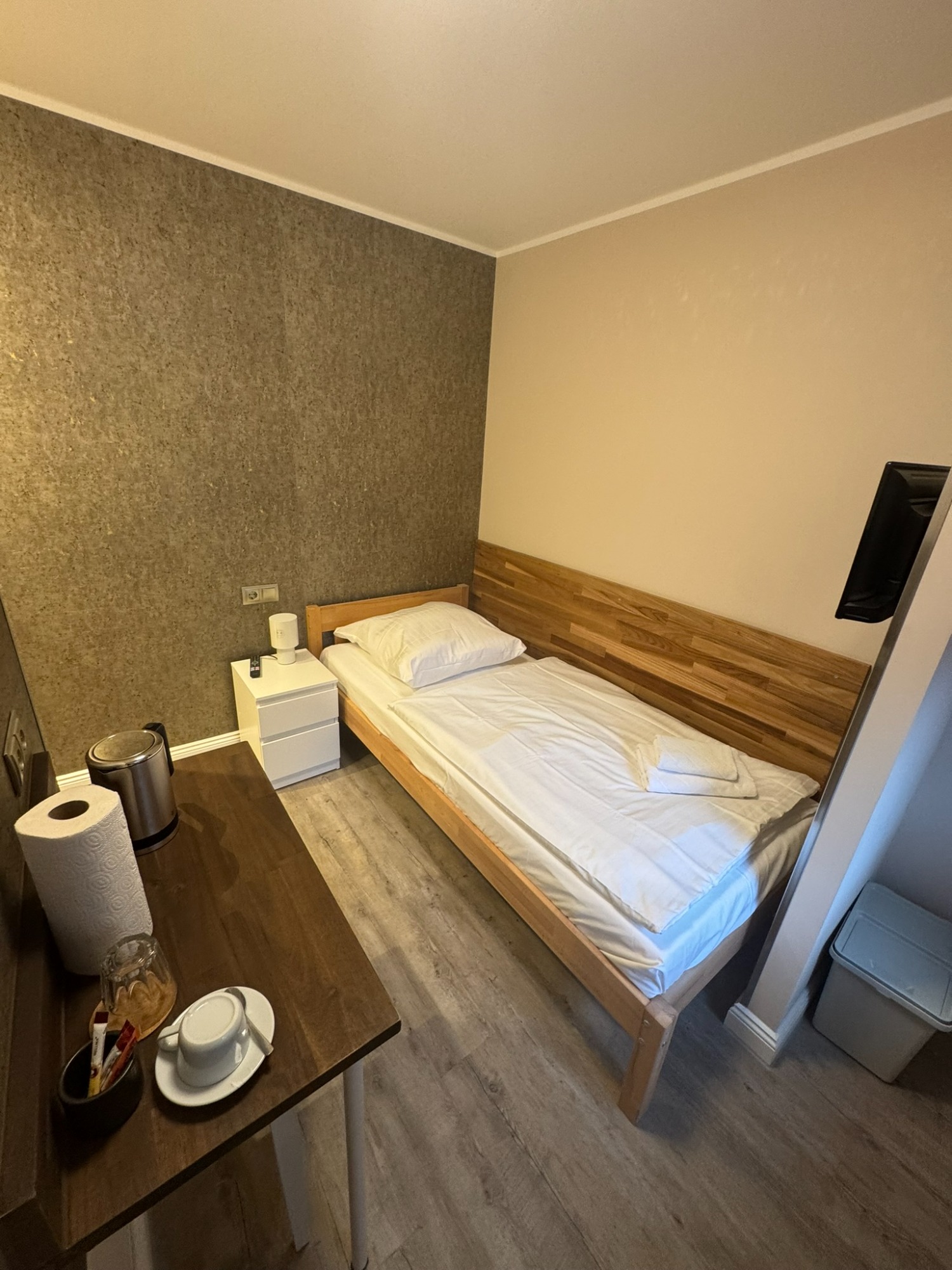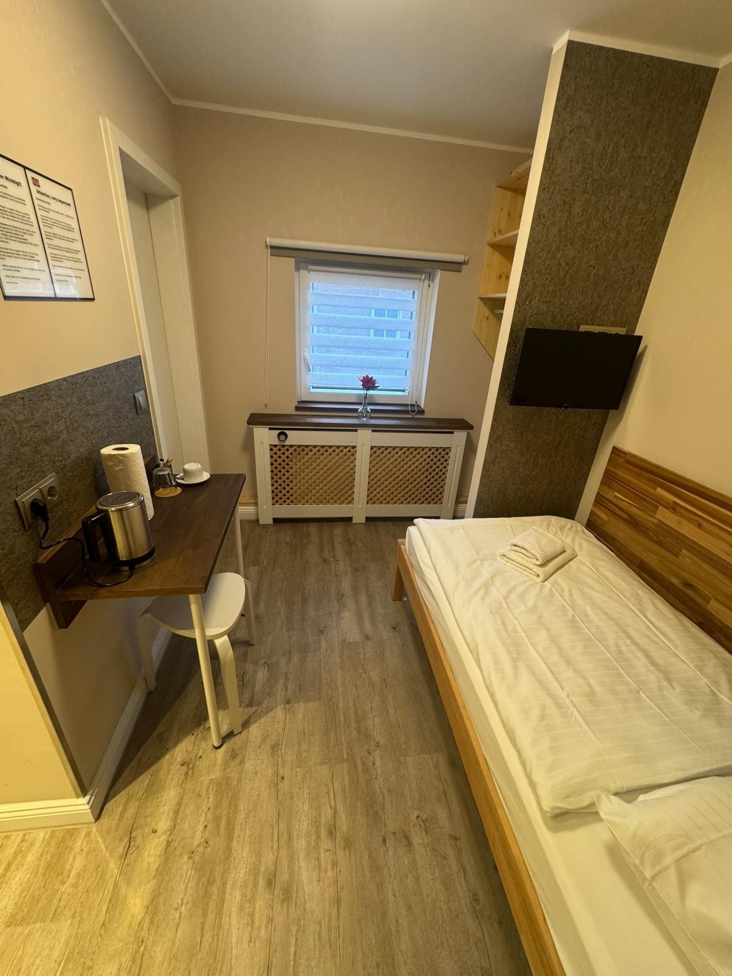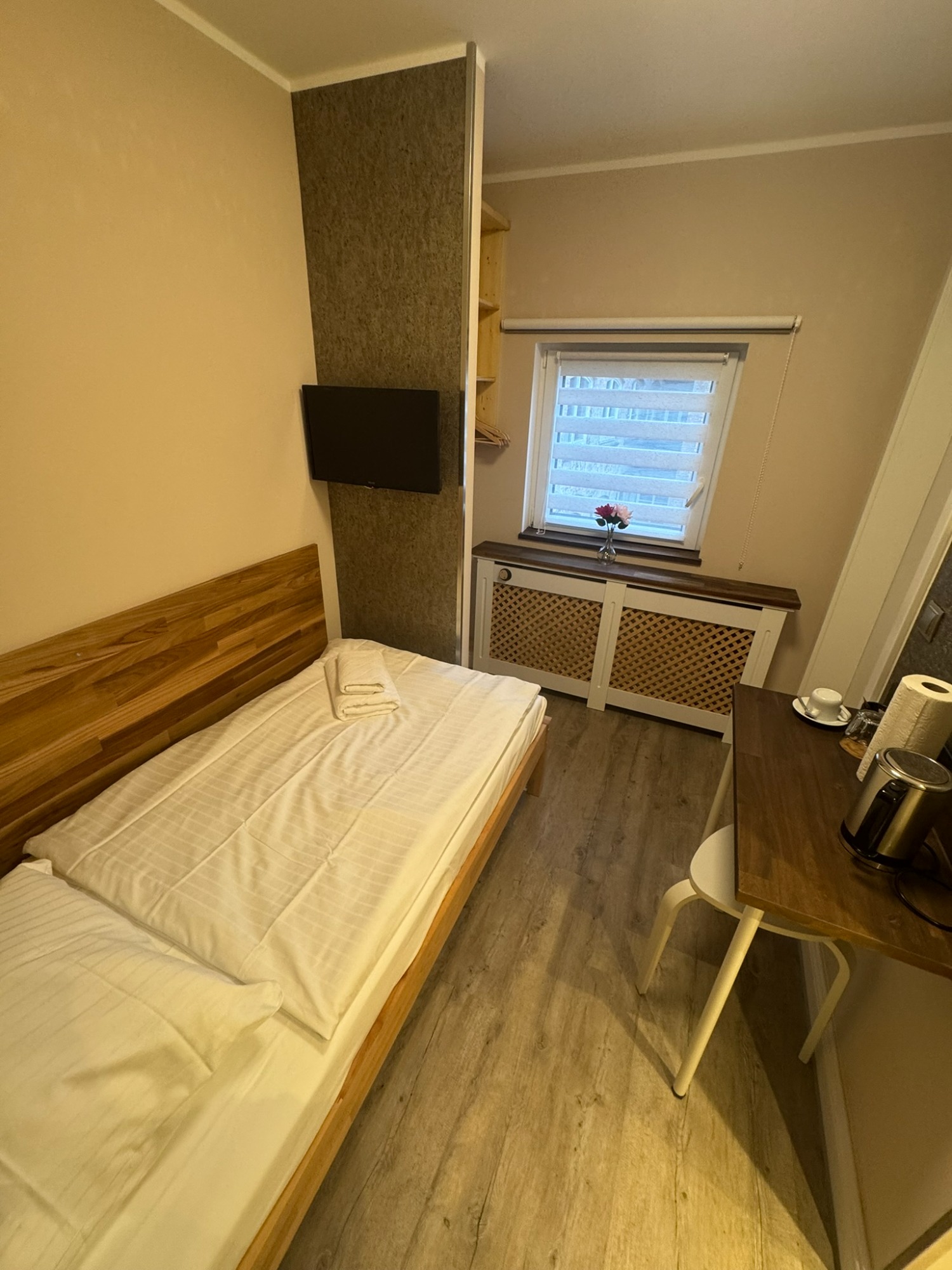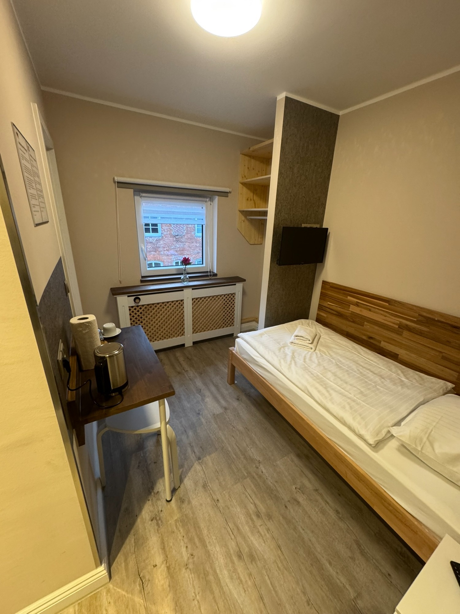 Einzelzimmer mit eigenem Bad und WC, 3. Obergeschoss mit Blick auf den Innenhof.