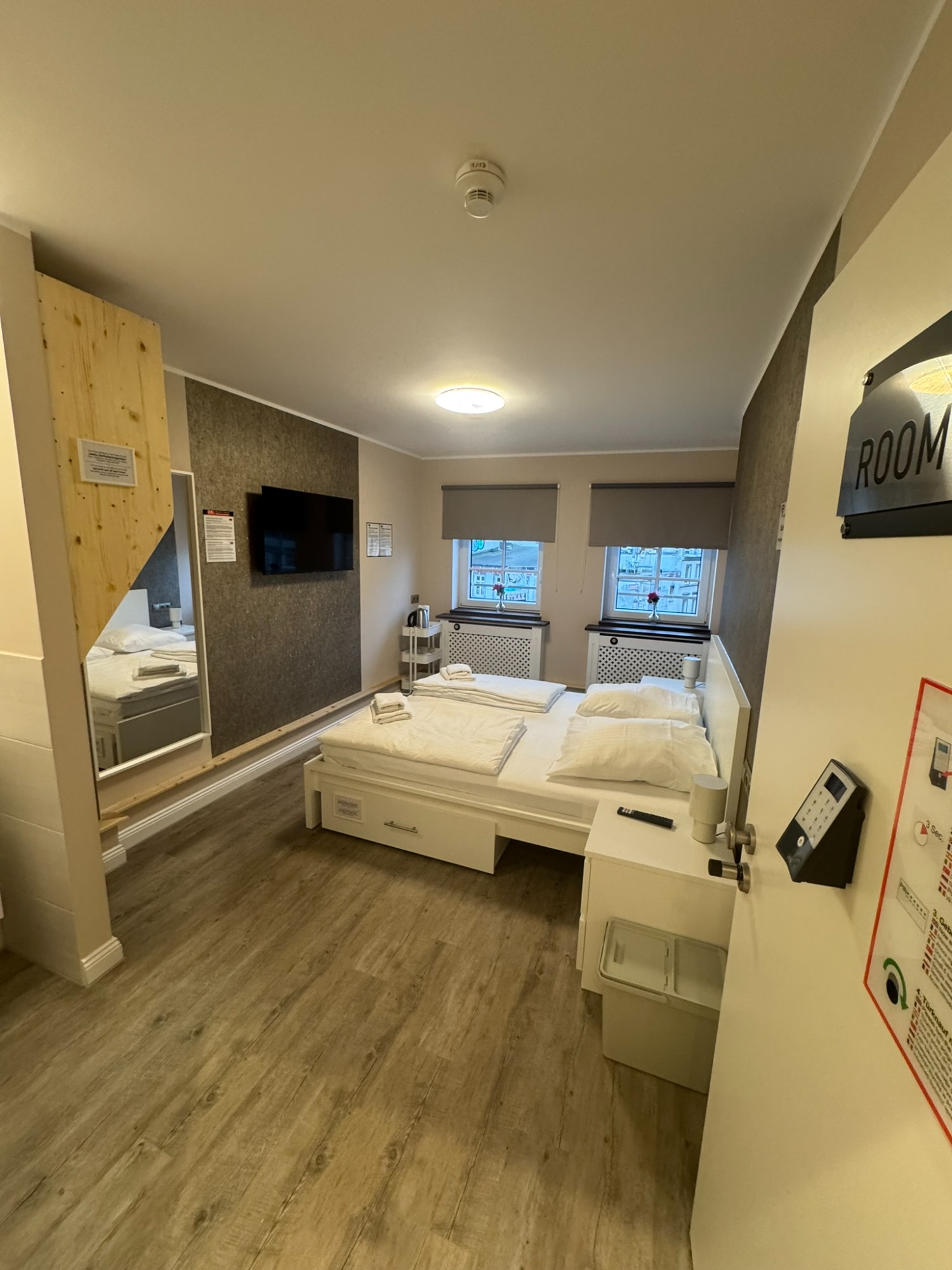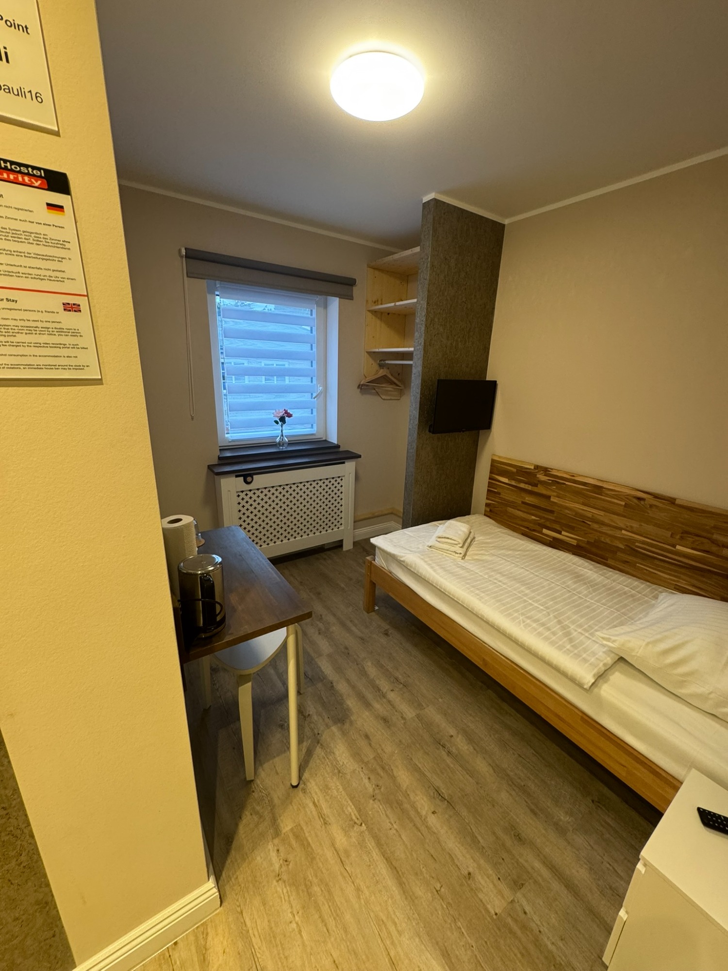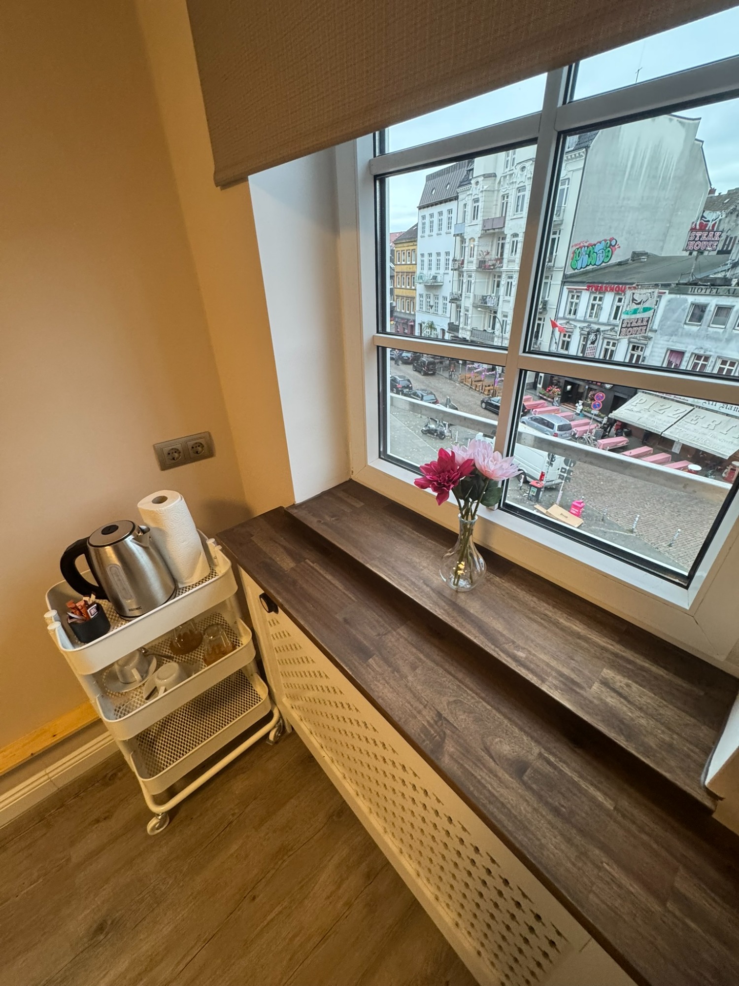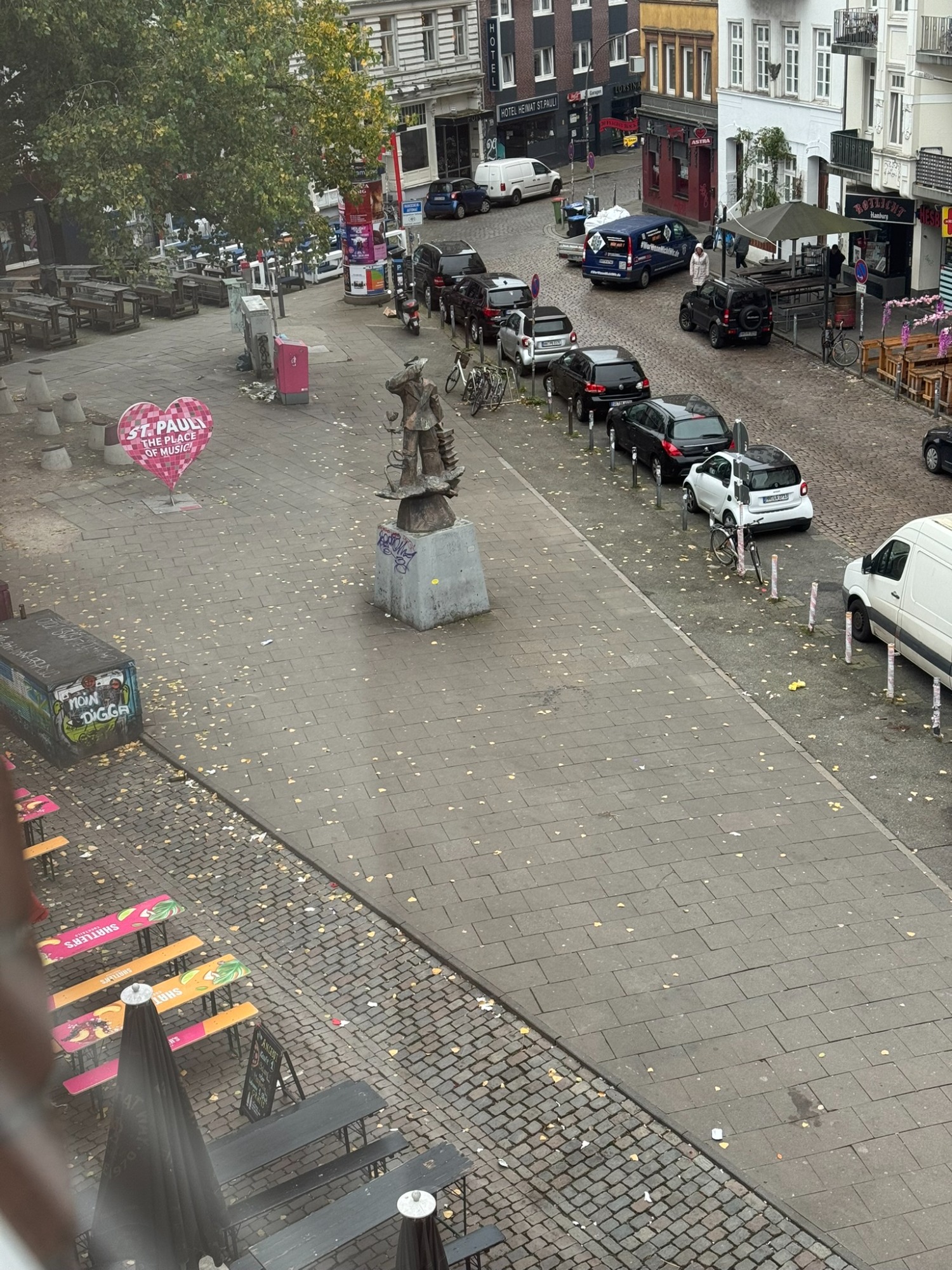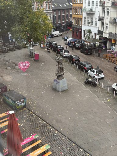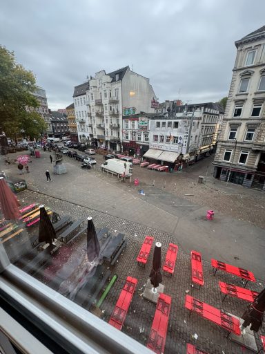 Doppelzimmer mit eigenem Bad und WC, 3. Obergeschoss mit Blick auf den Hans-Albers-Platz.