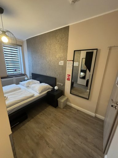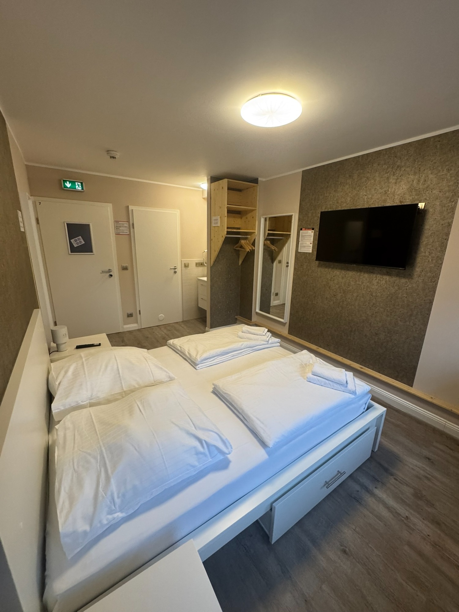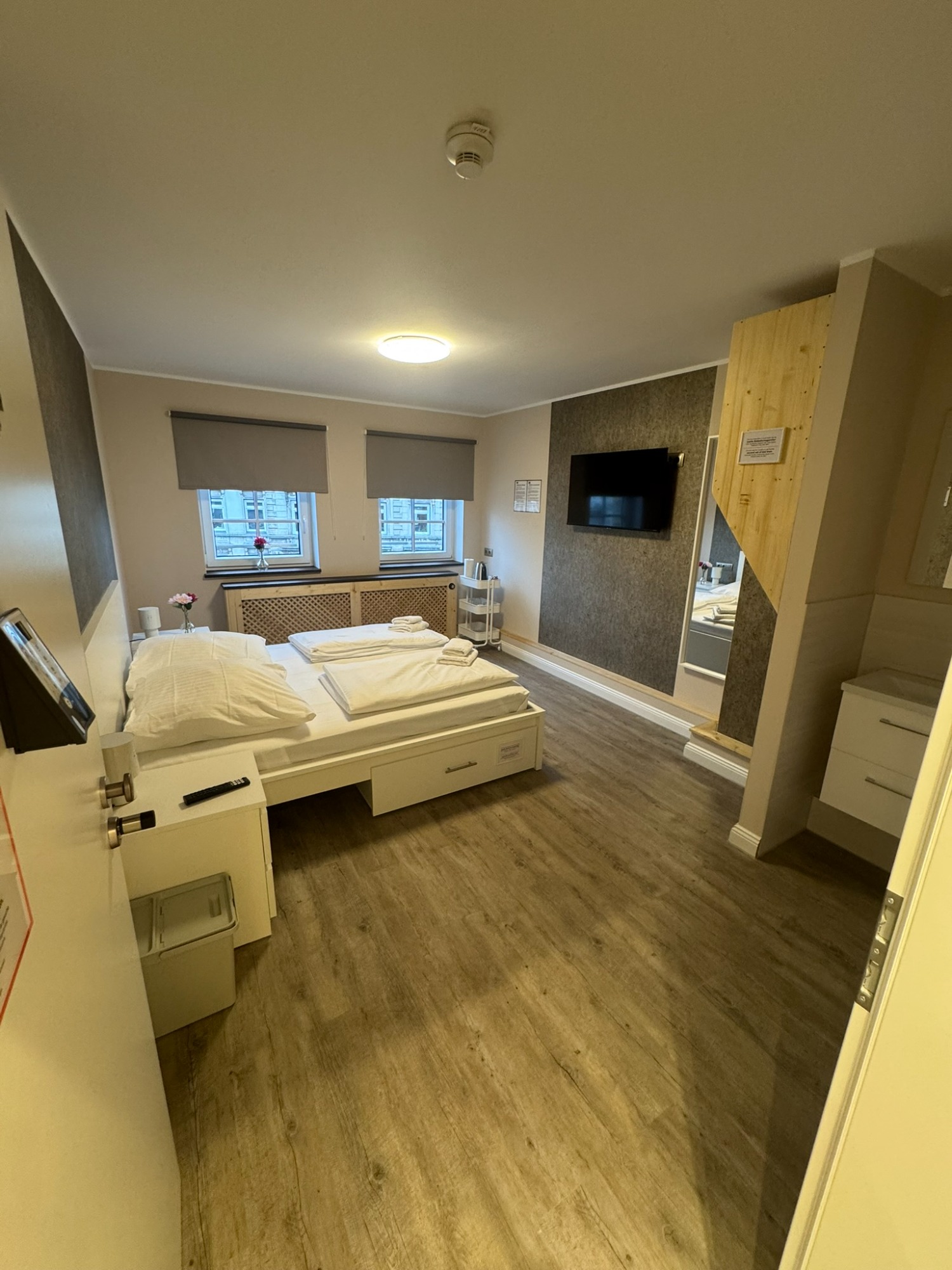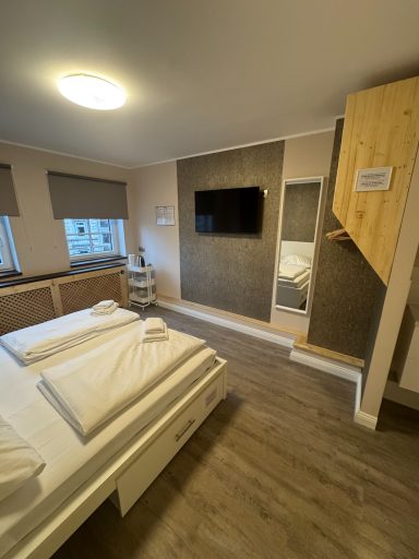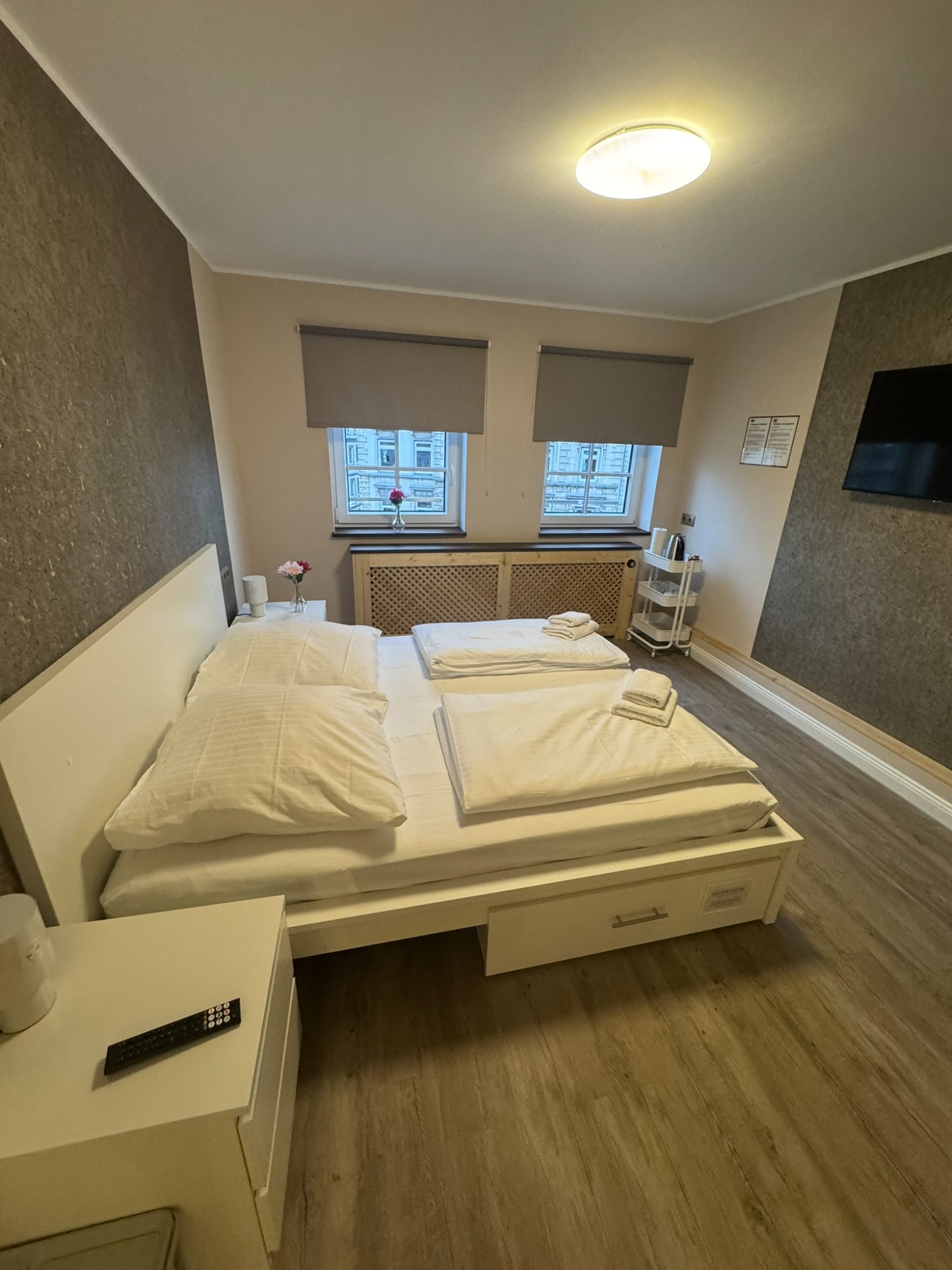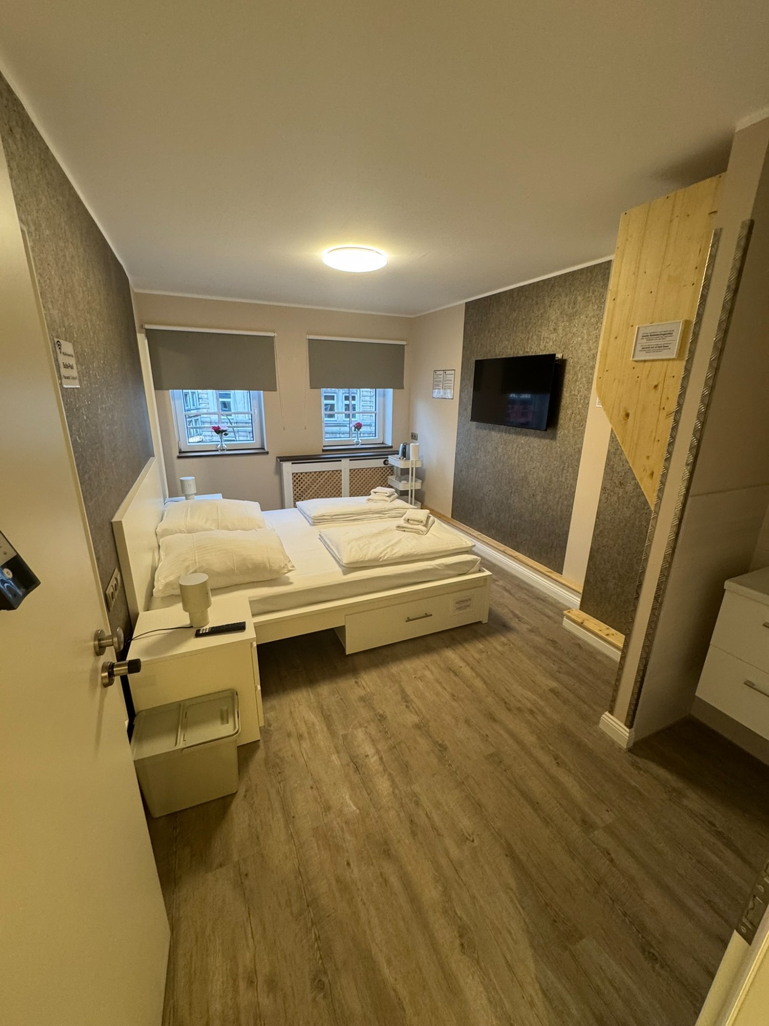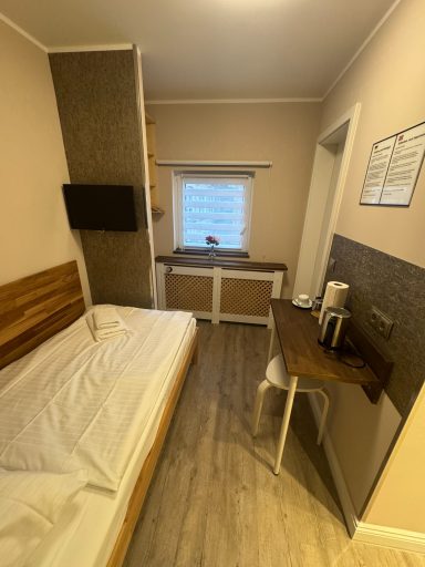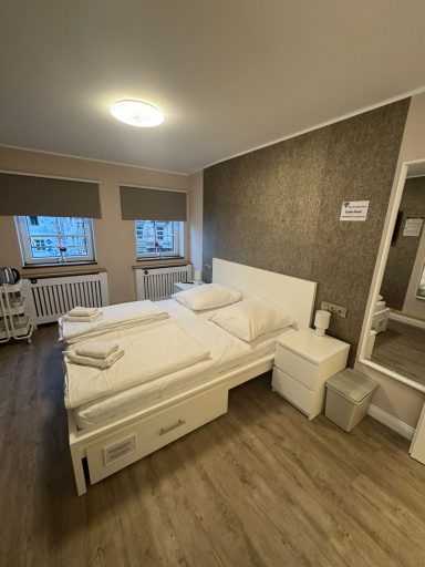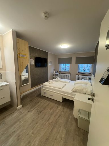 Großes Doppelzimmer mit eigenem Bad und WC, 3. Obergeschoss mit Blick auf den Hans-Albers-Platz.