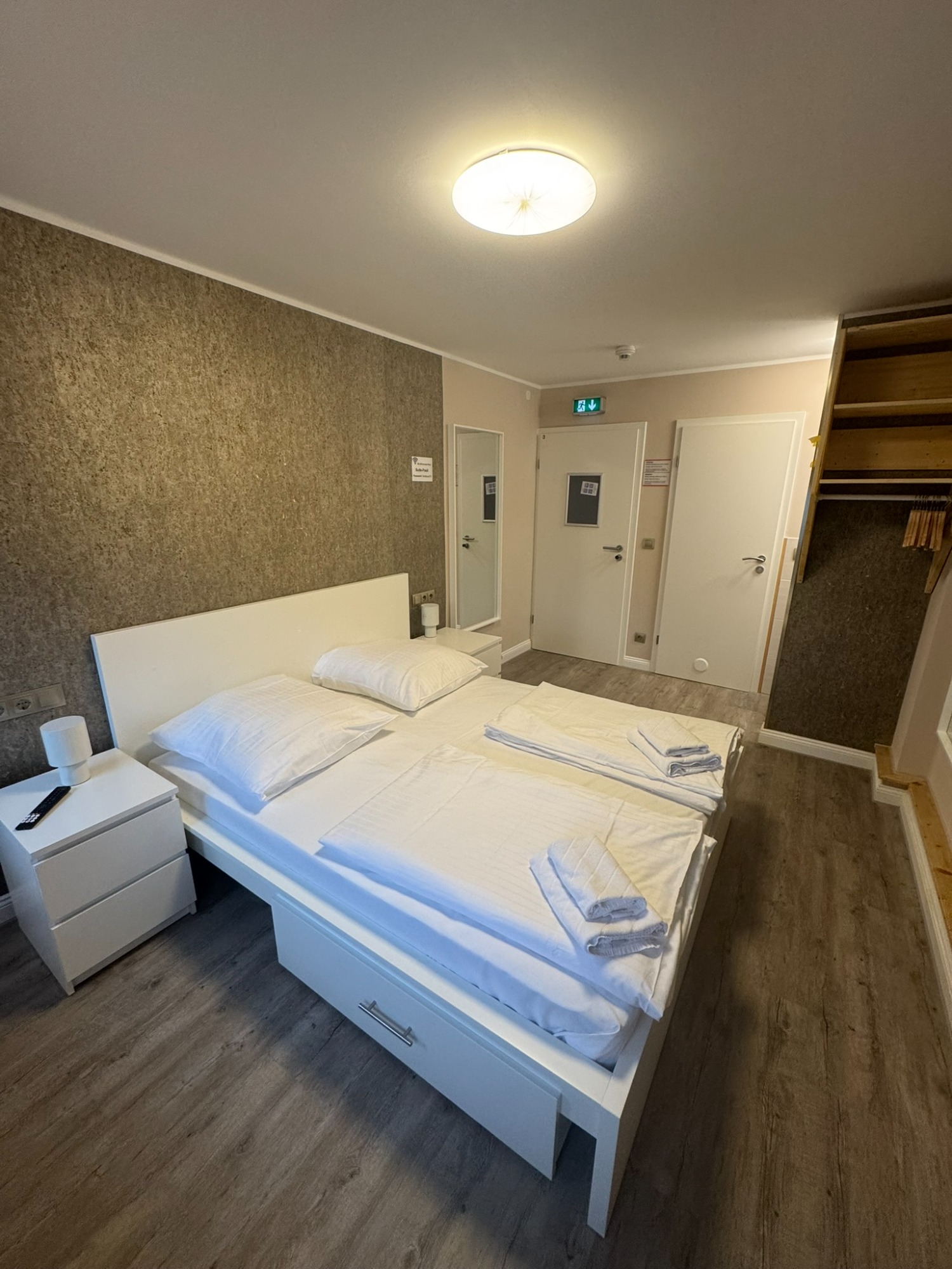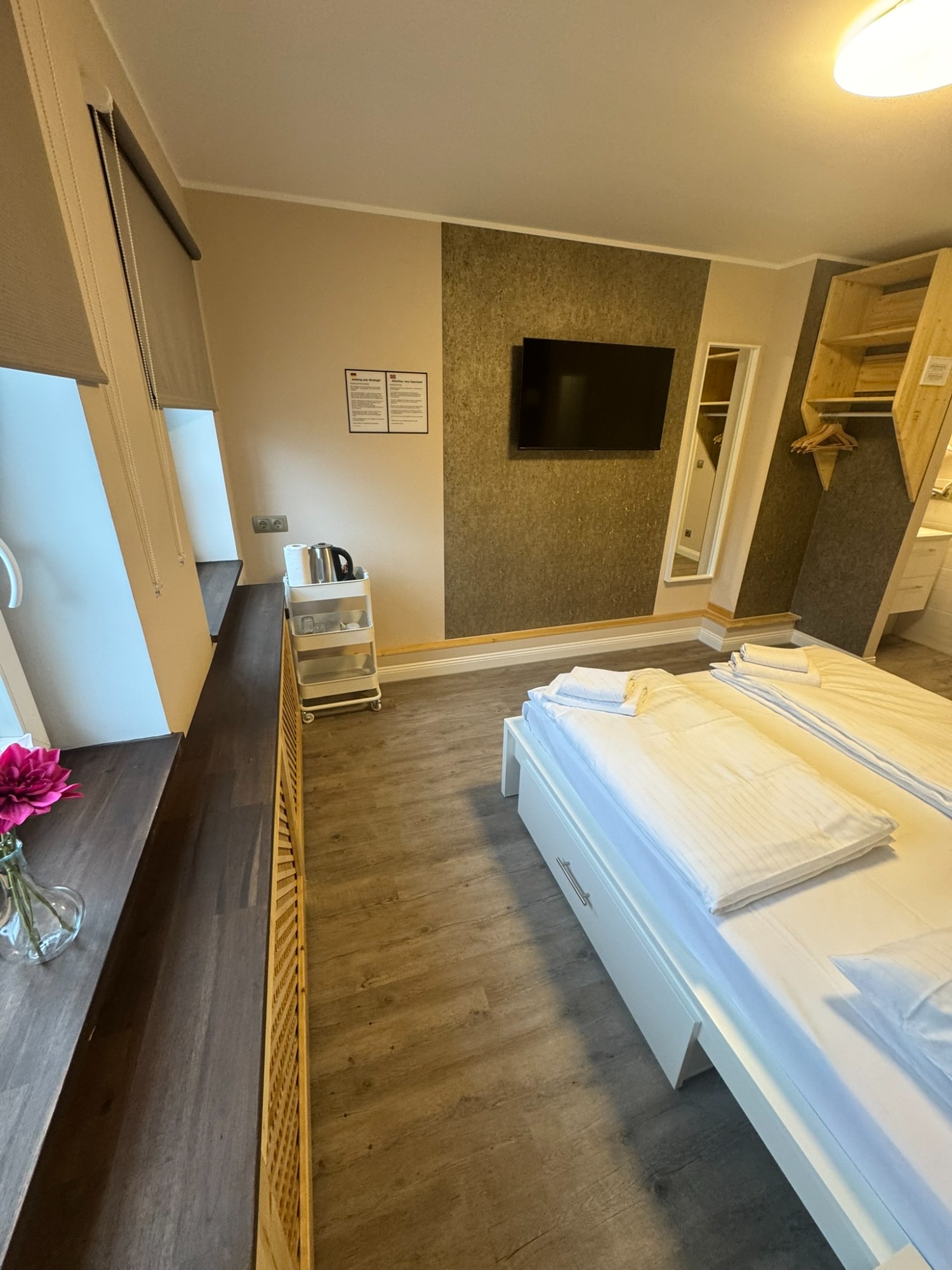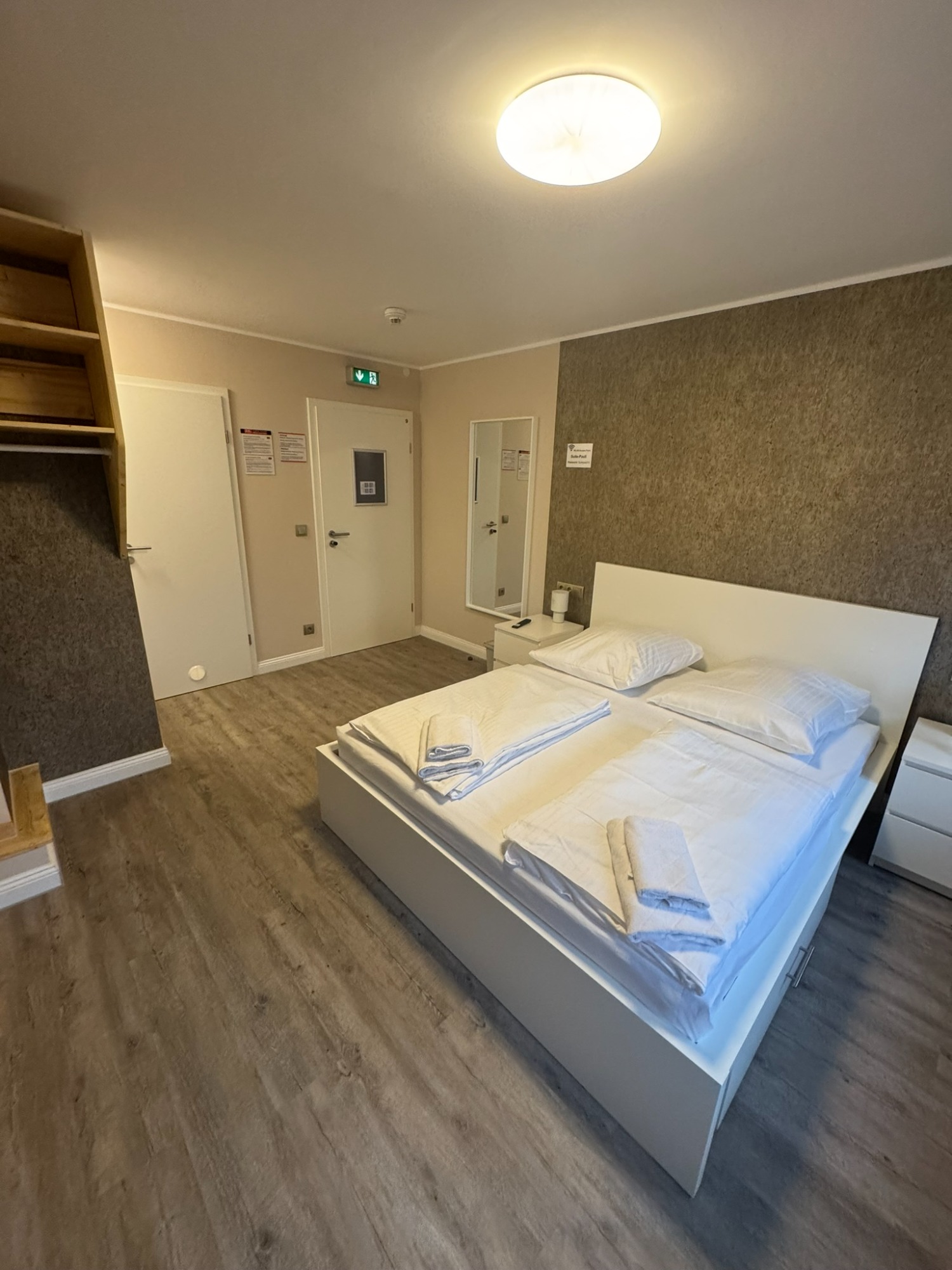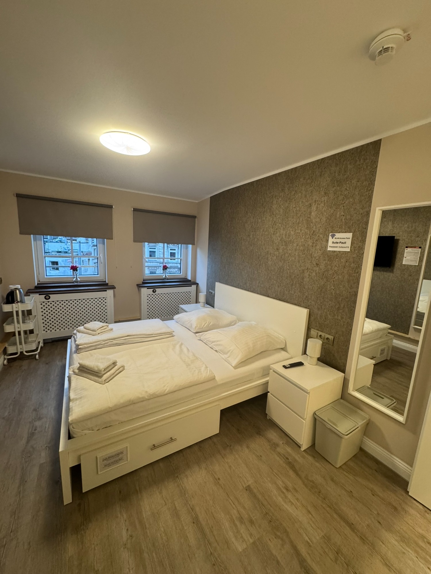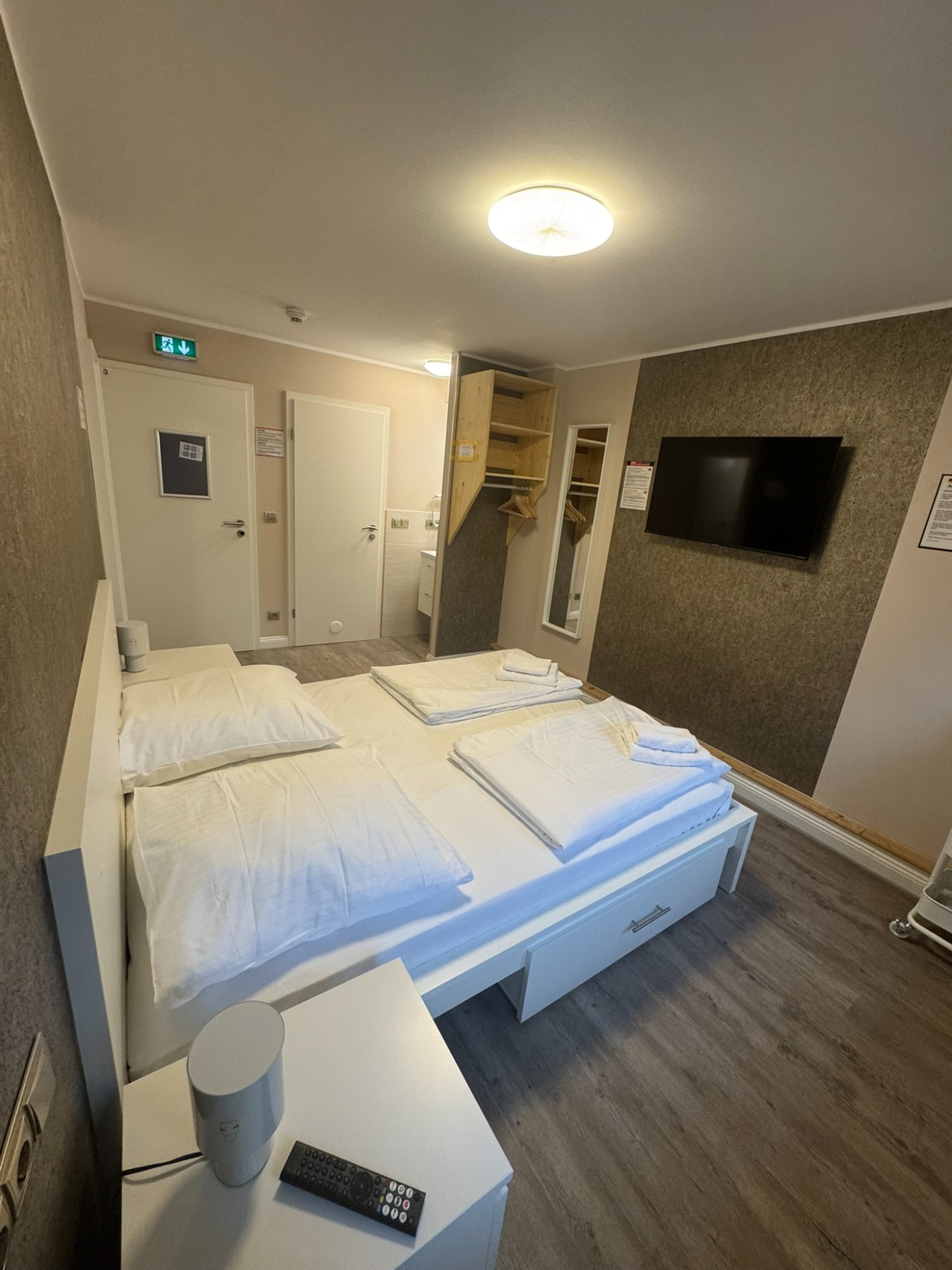 Großes Doppelzimmer mit eigenem Bad und WC, 3. Obergeschoss mit Blick auf den Hans-Albers-Platz.