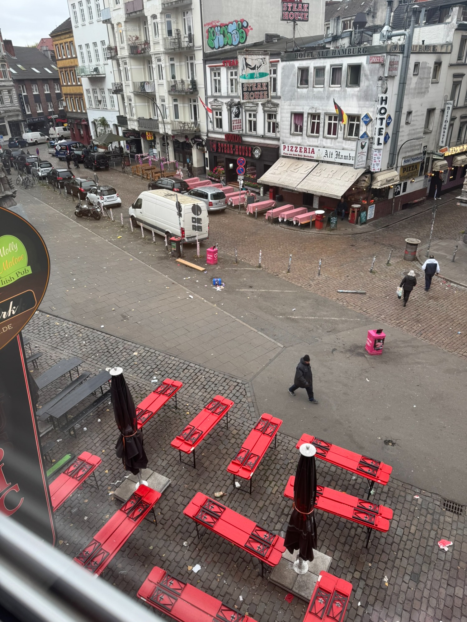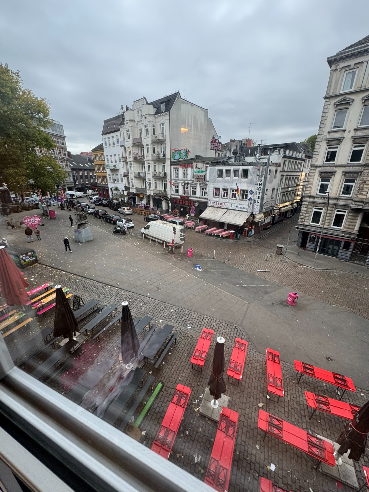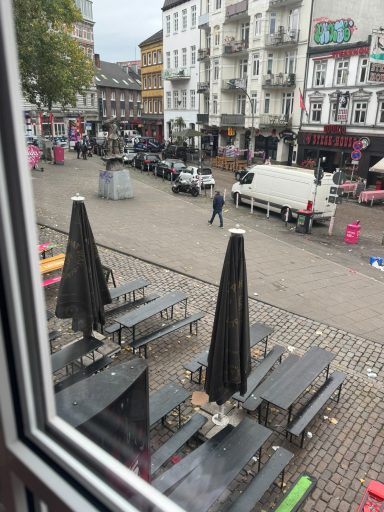 Doppelzimmer mit eigenem Bad und WC, 2. Obergeschoss mit Blick auf den Hans-Albers-Platz.