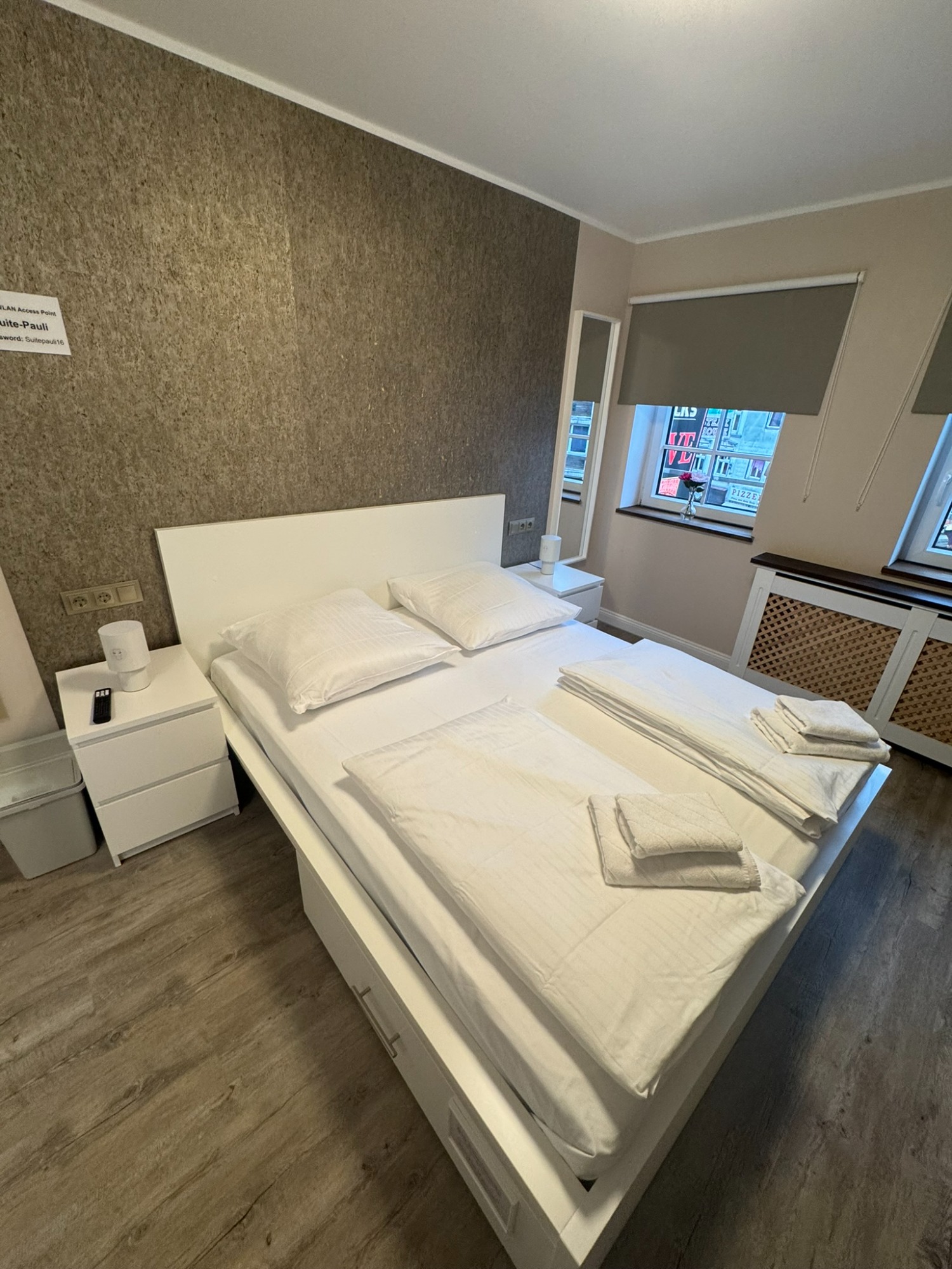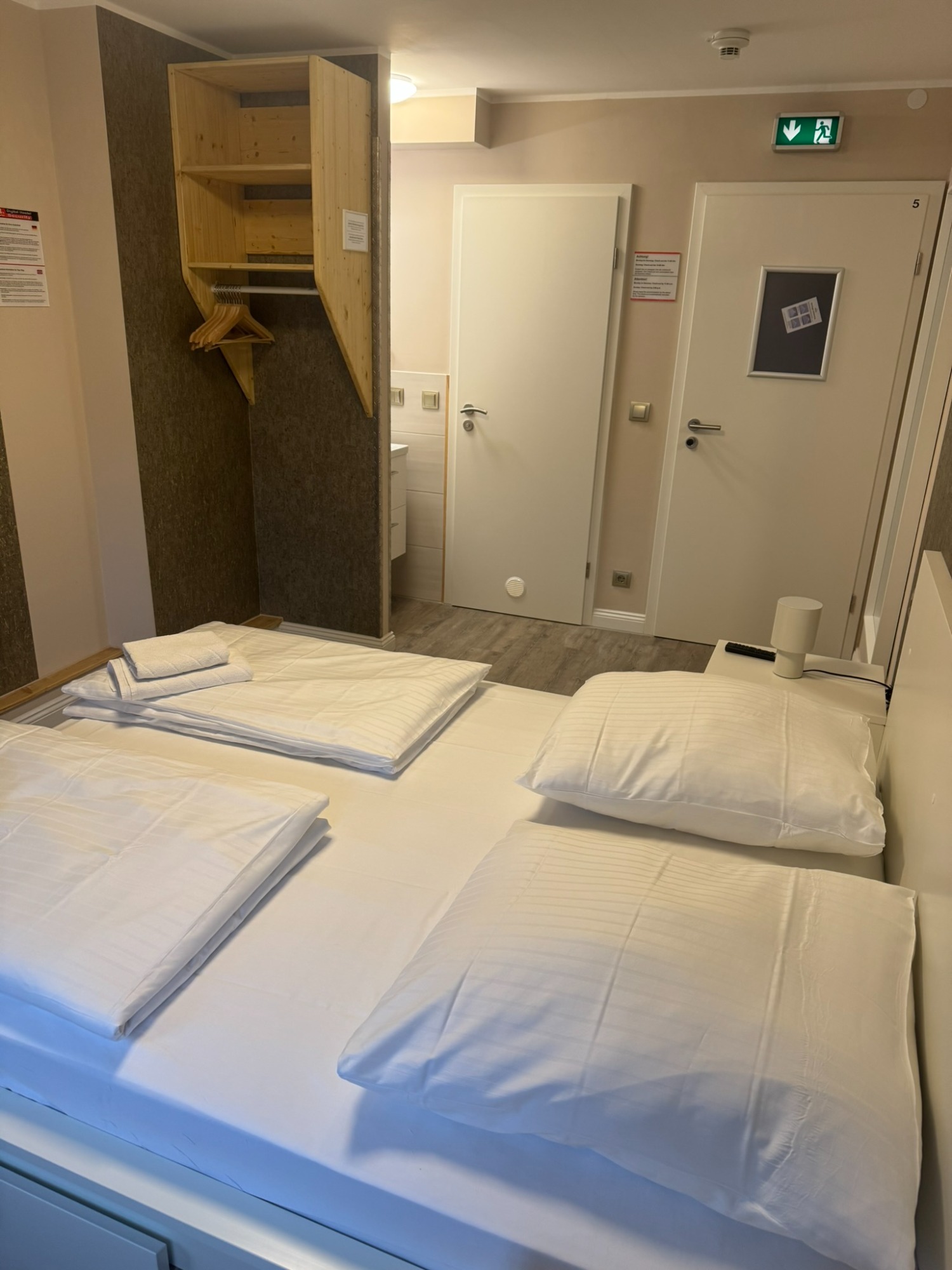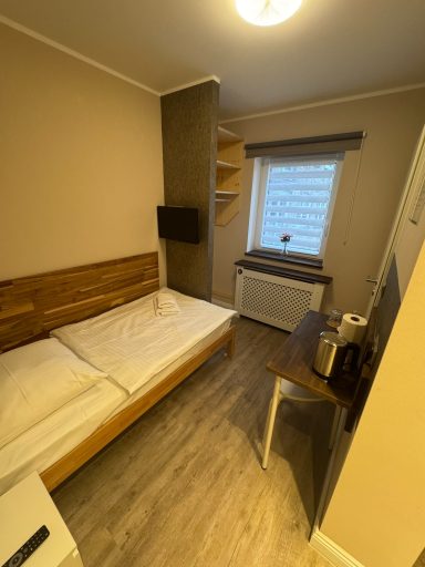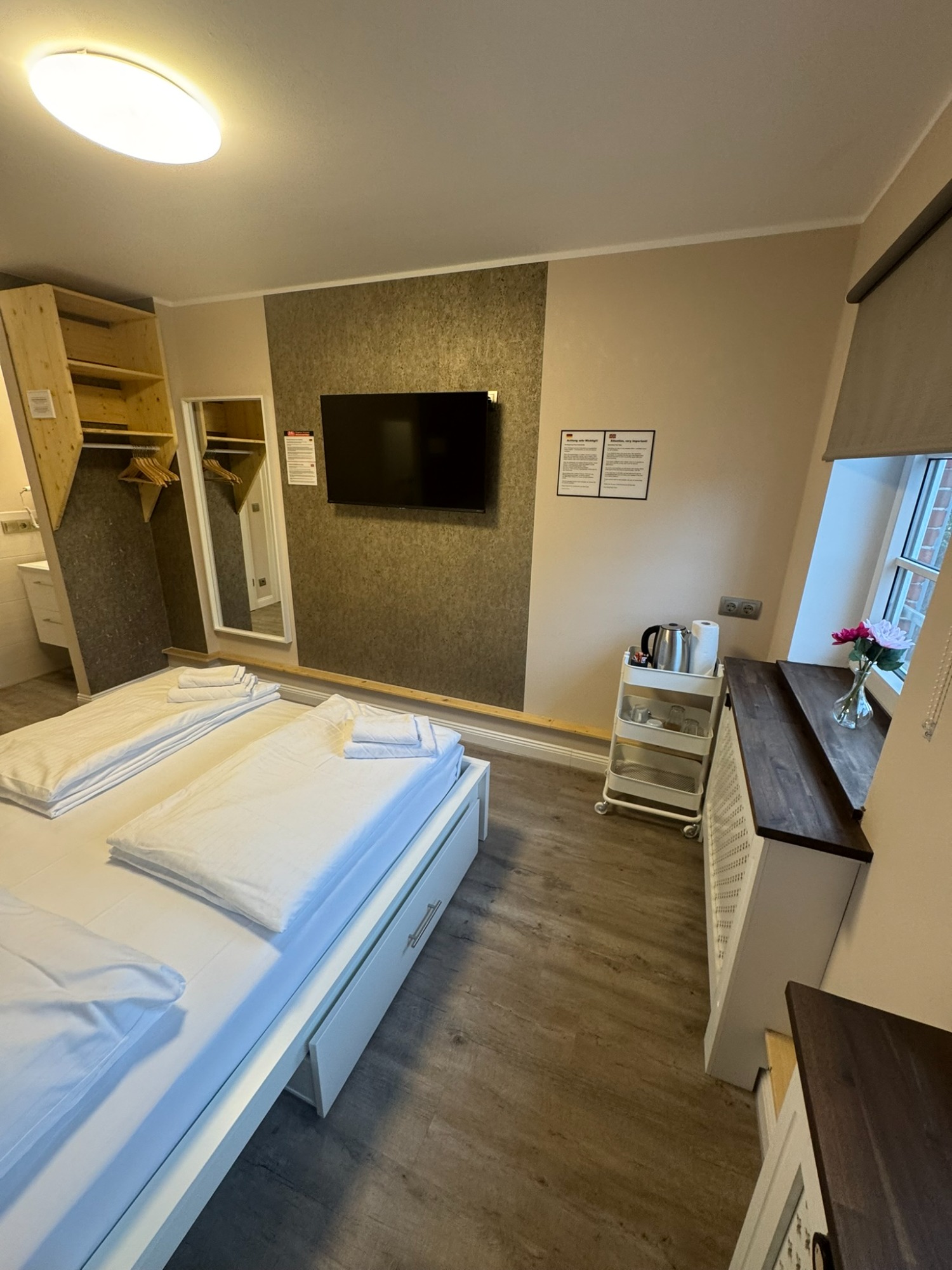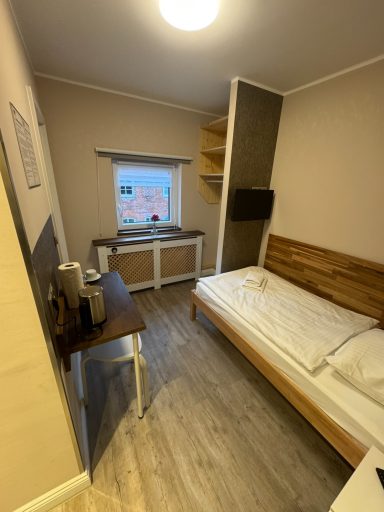 Doppelzimmer mit eigenem Bad und WC, 1. Obergeschoss mit Blick auf den Hans-Albers-Platz.