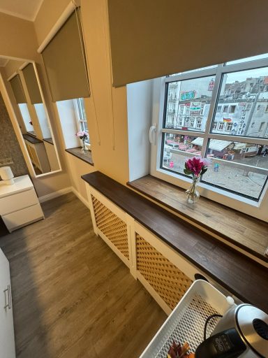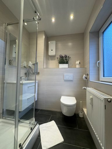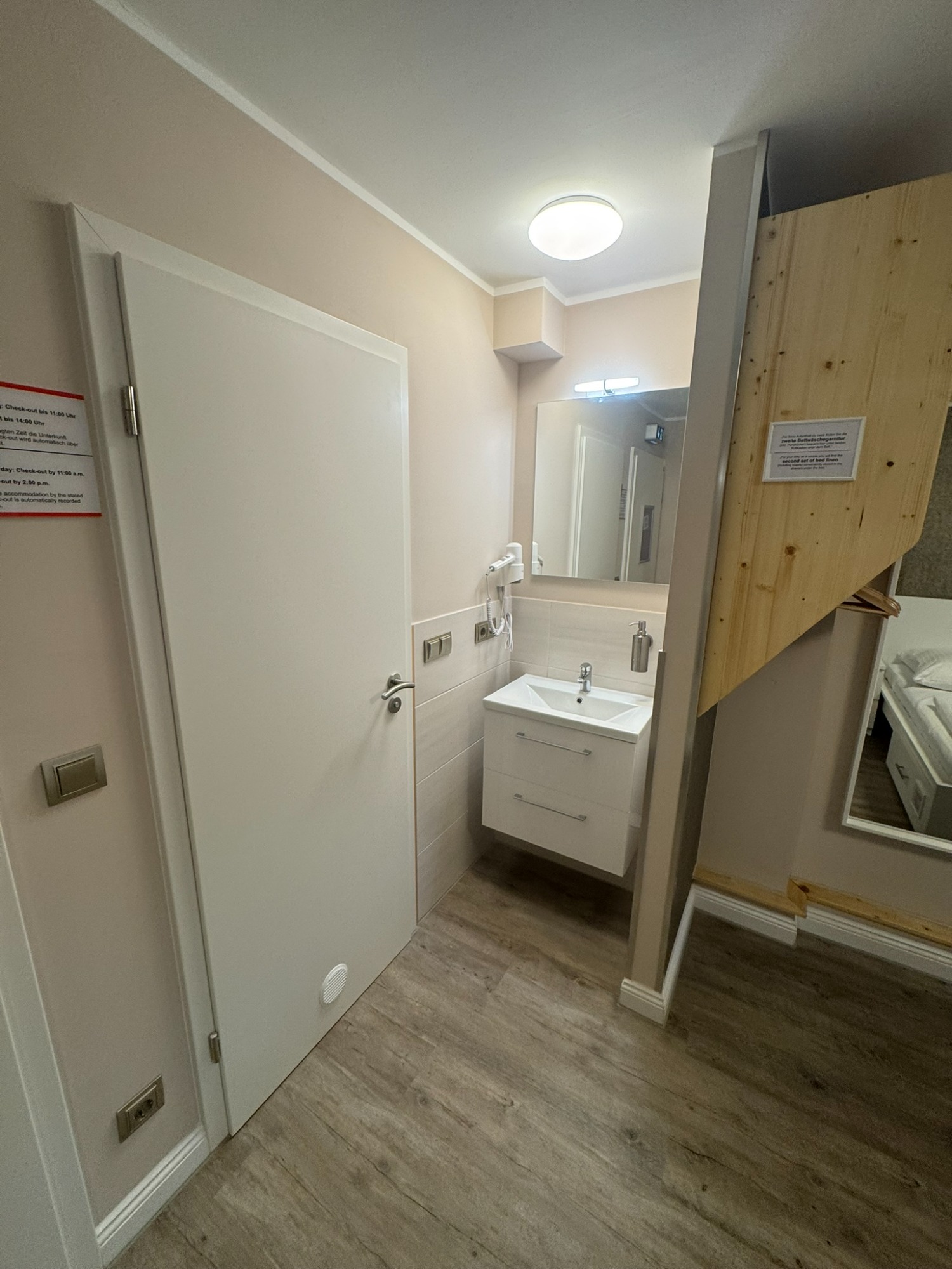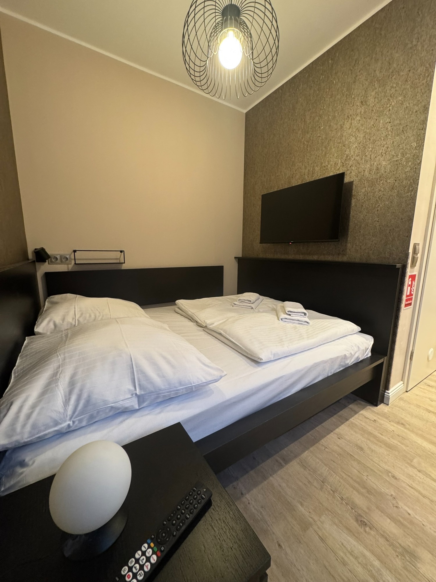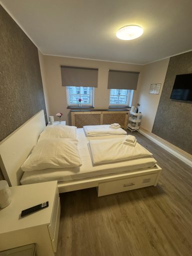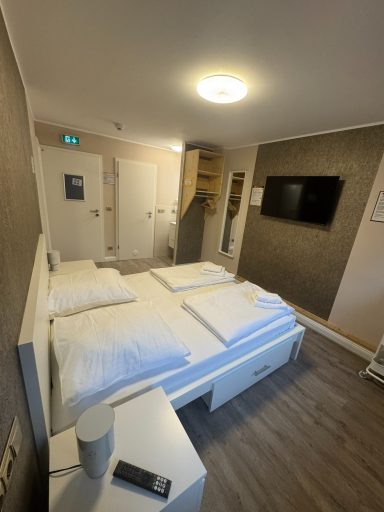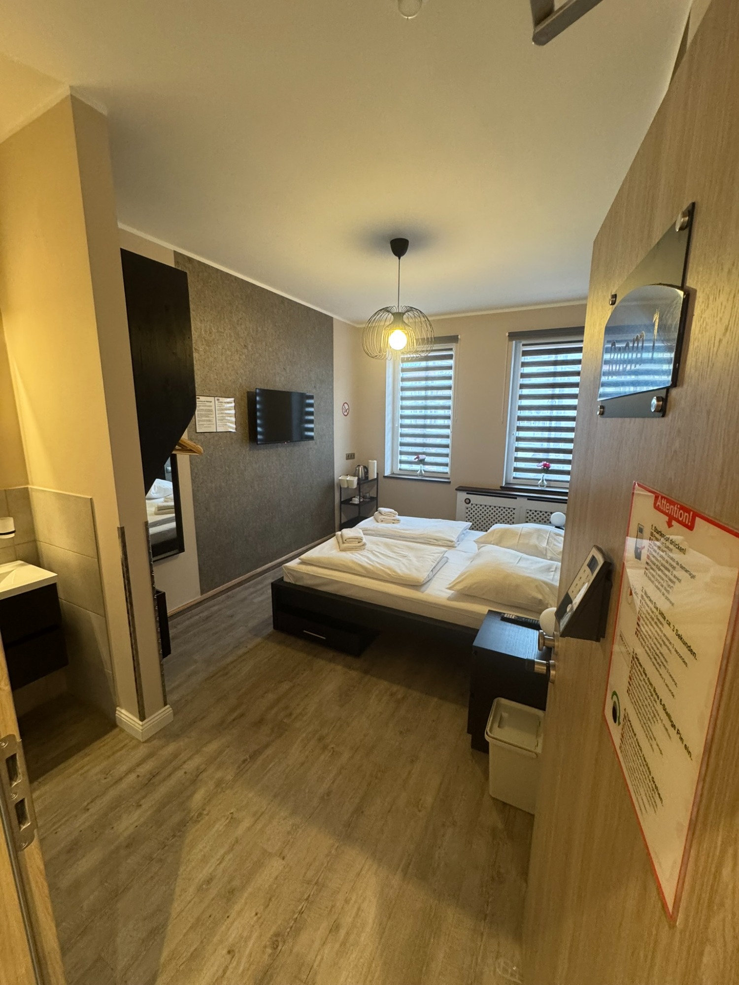 Doppelzimmer mit eigenem Bad und WC, 1. Obergeschoss mit Blick auf den Hans-Albers-Platz.